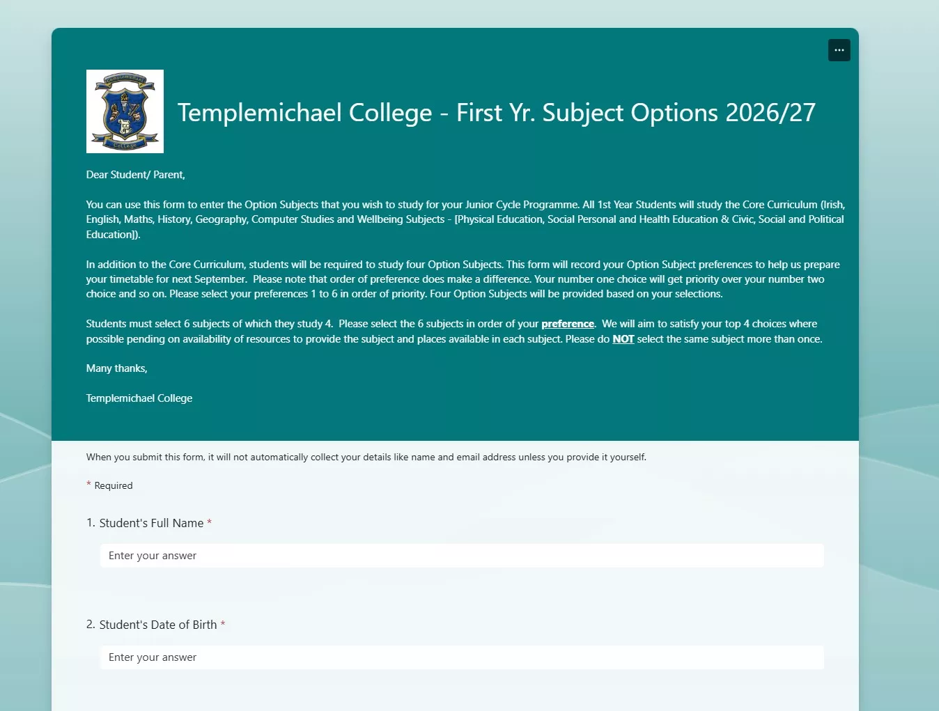 Click here to make your Subject Choices for 1st yr Sept 2026